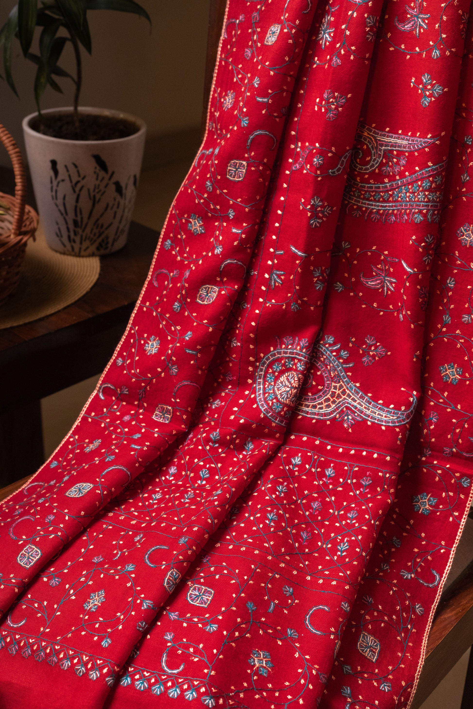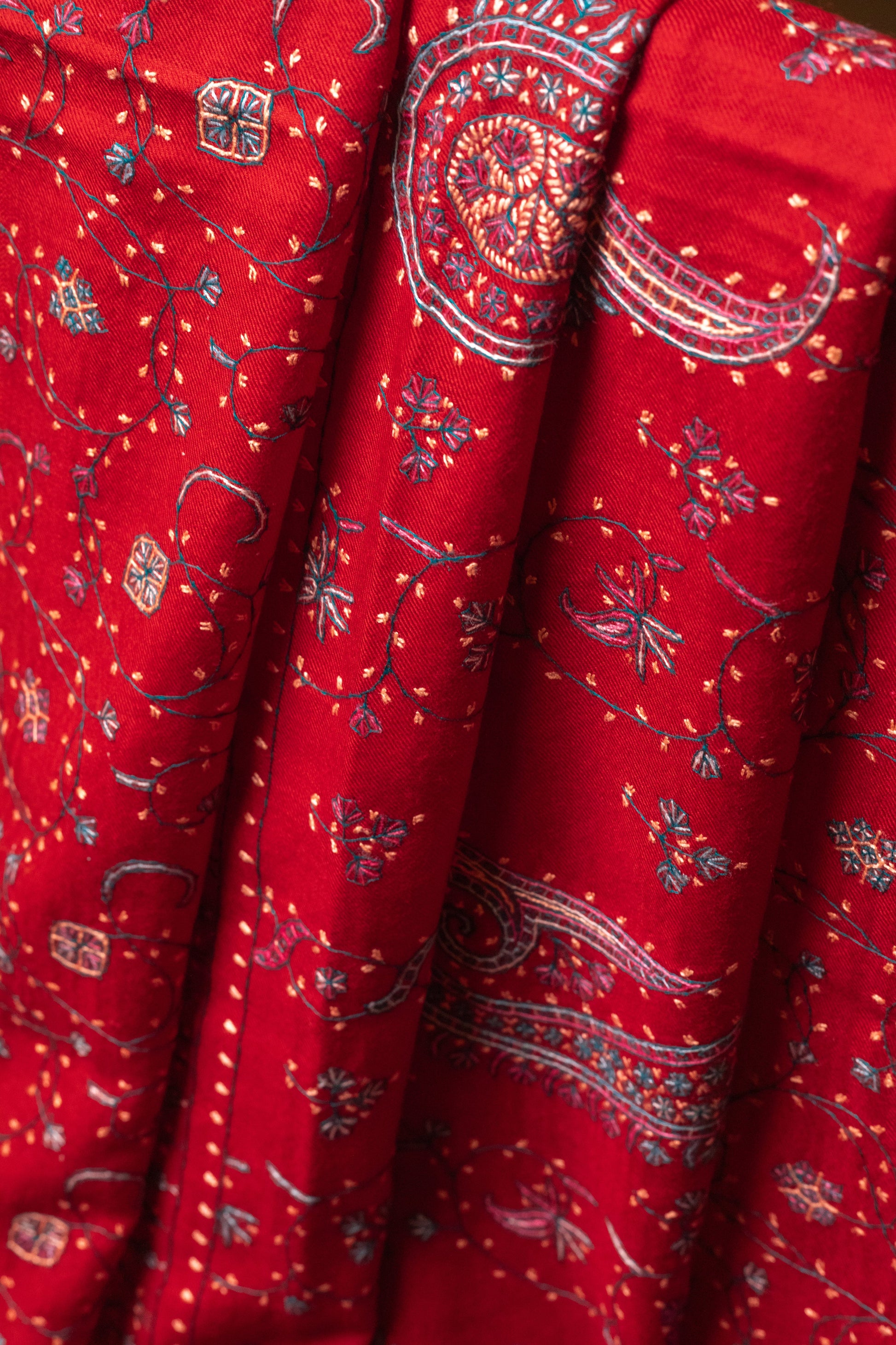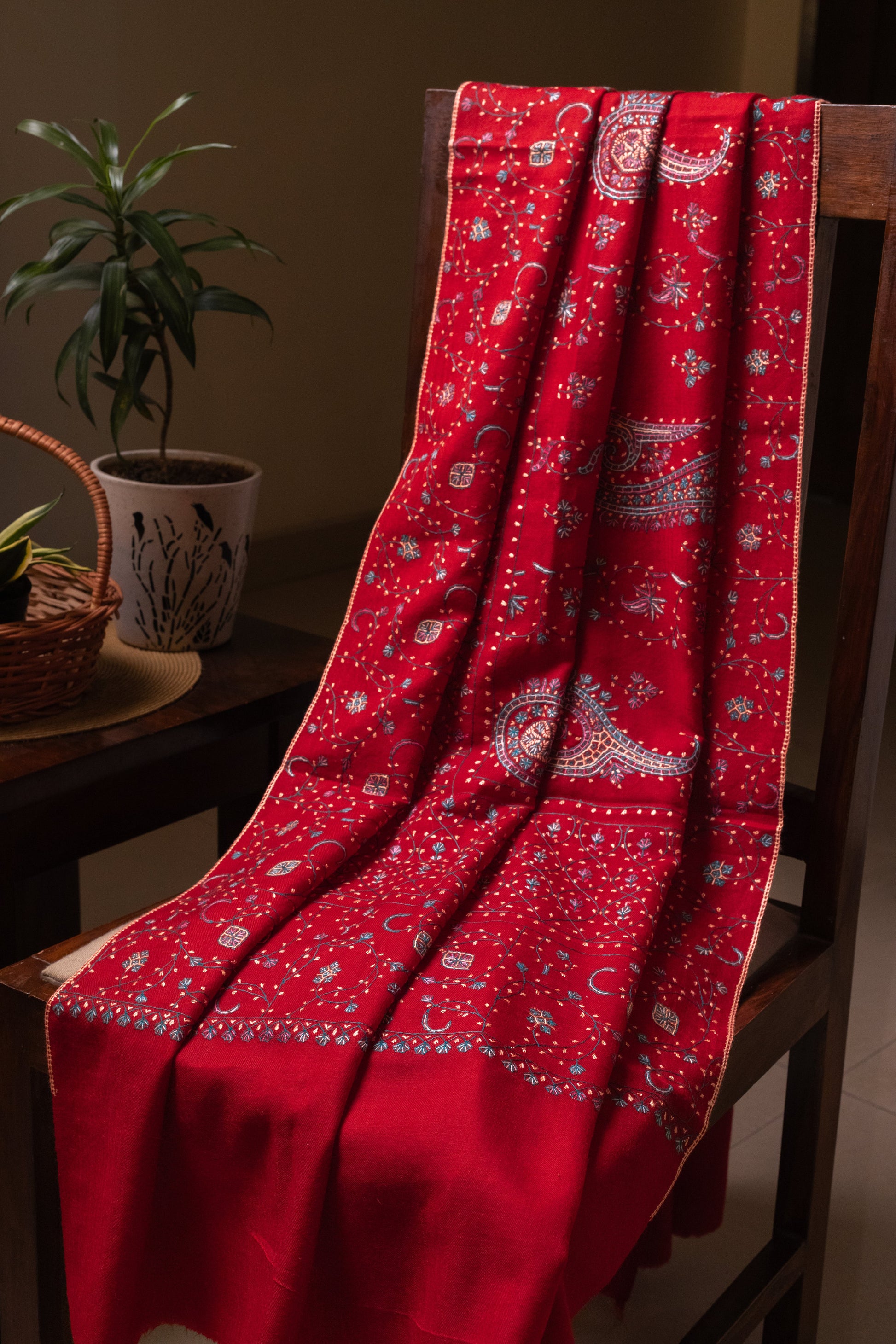 Rich maroon, intricate Jaal work, and delicate Sozni embroidery—this shawl is a masterpiece of tradition and elegance.