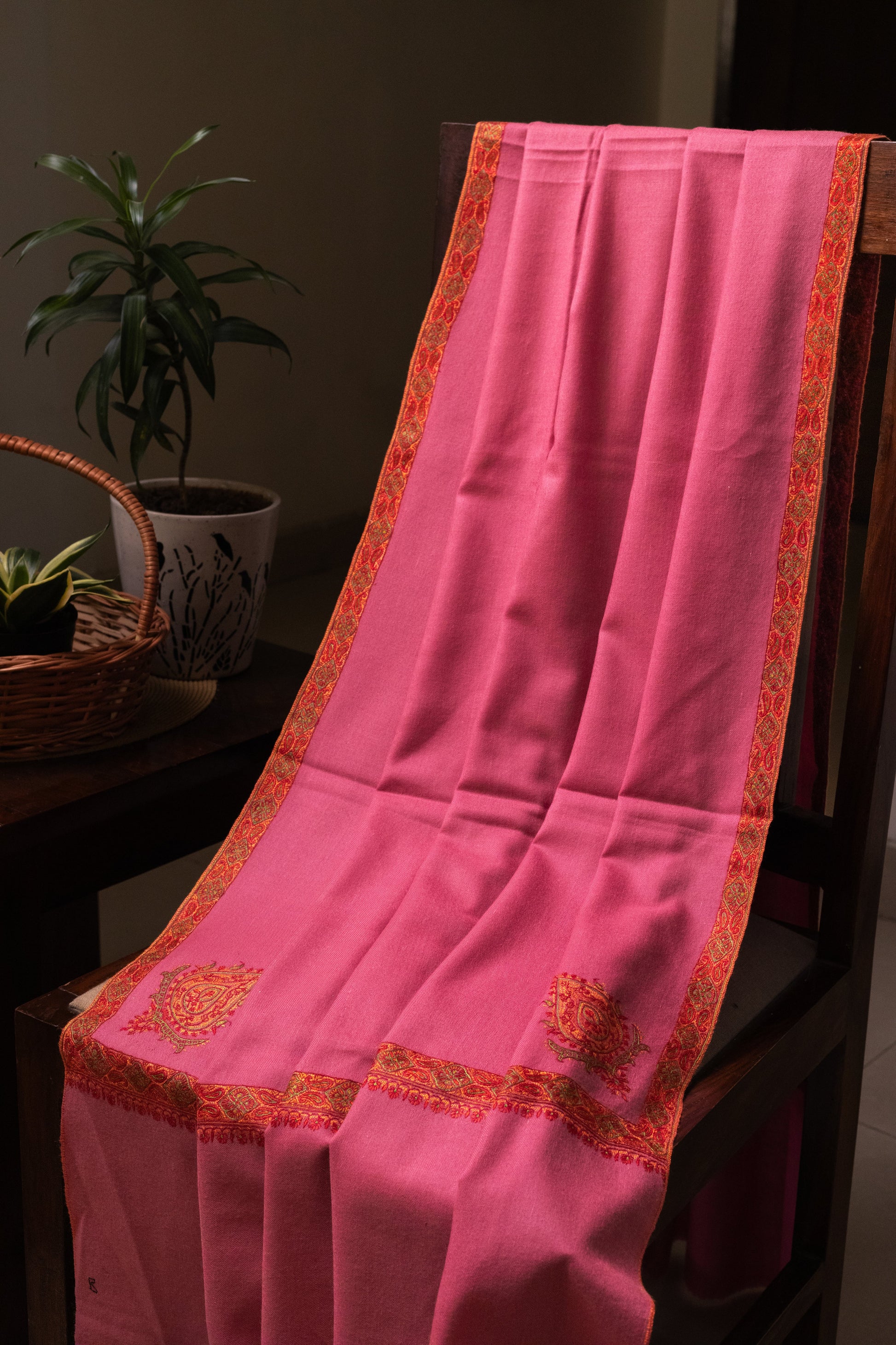 Grace meets tradition in our Mauve Pink Pashmina, adorned with a delicate Sozni embroidery border and intricate Badami motif.