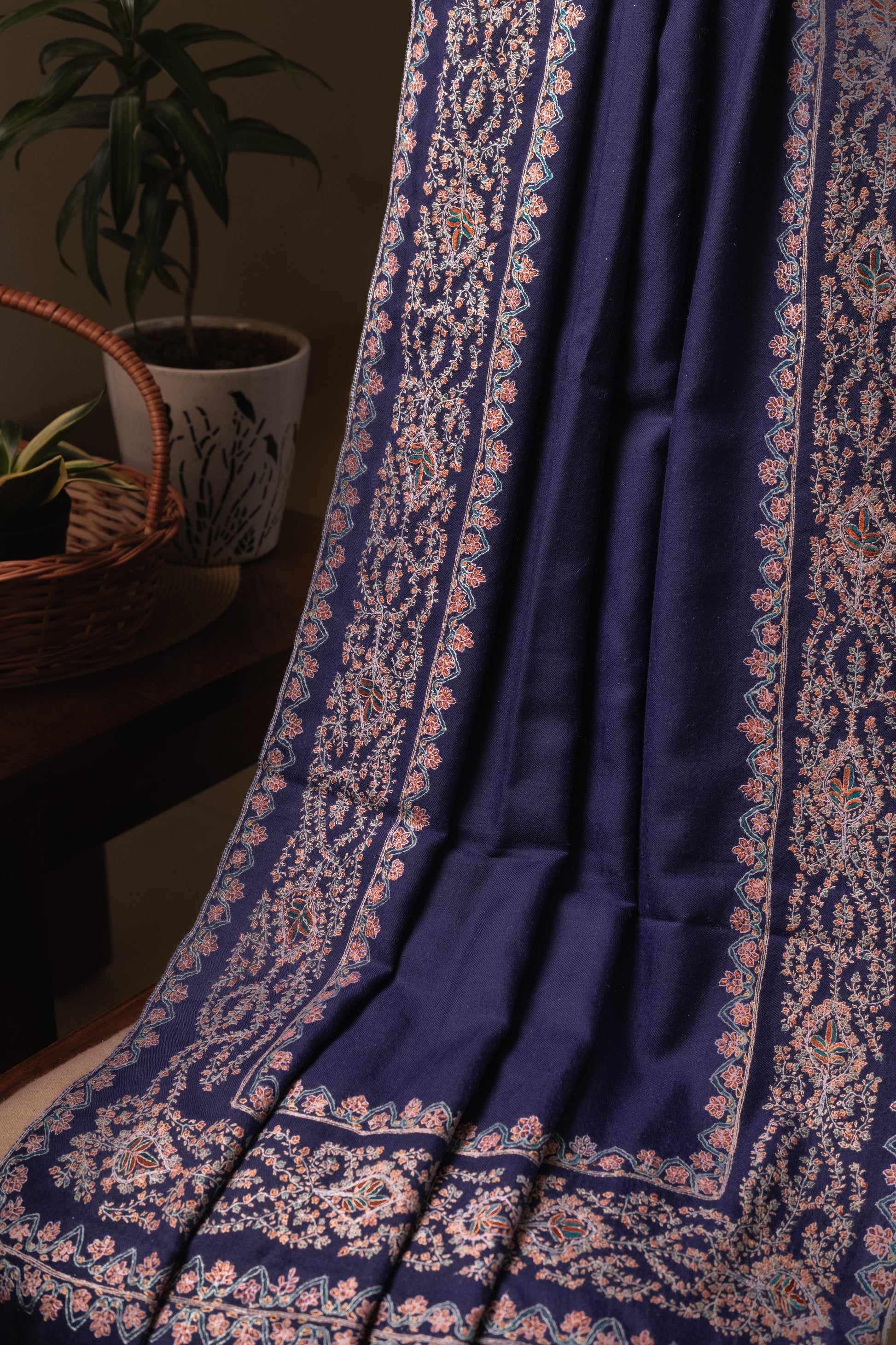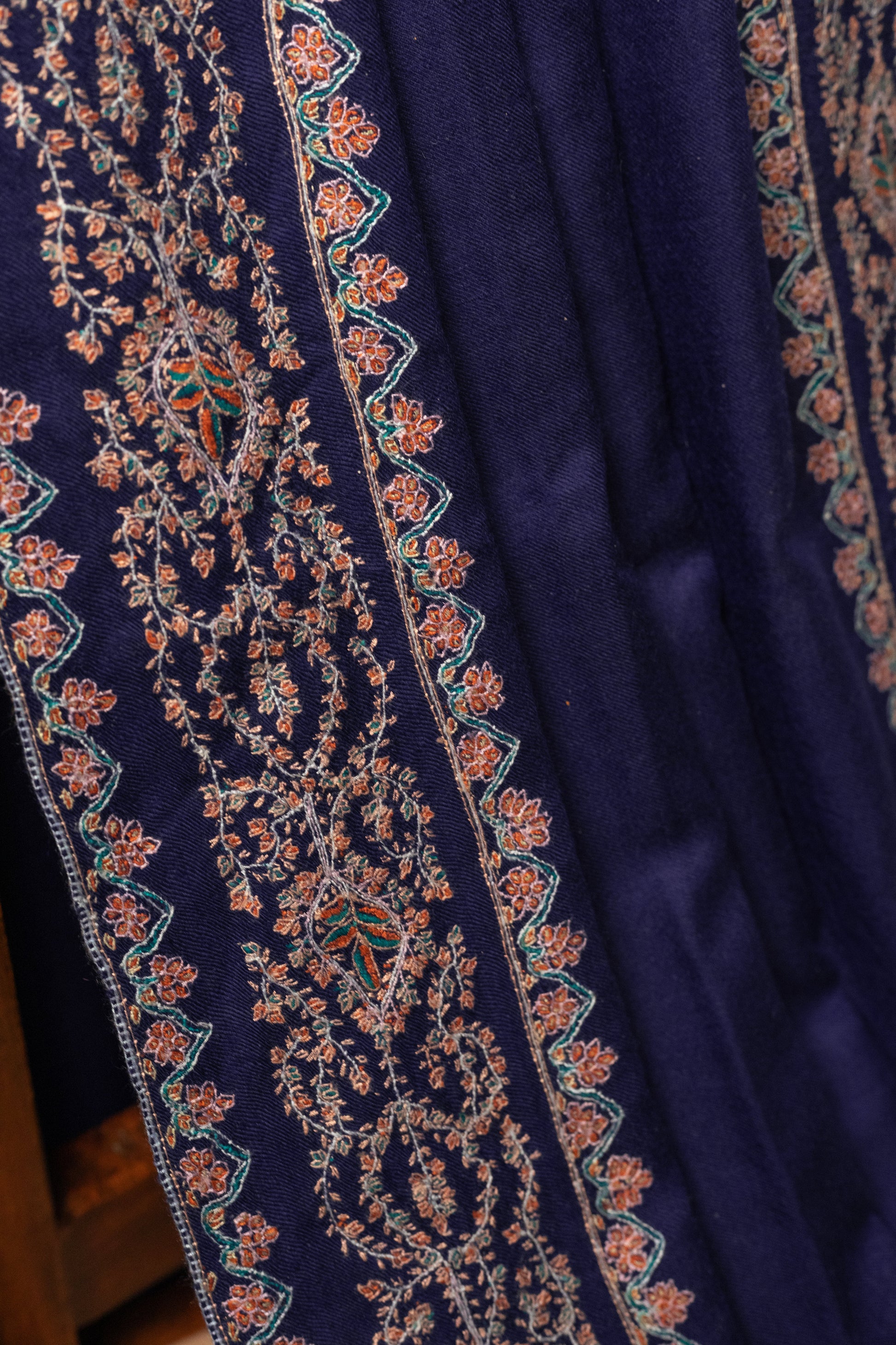 Wrap yourself in the elegance of our Royal Blue Pashmina with Sozni Embroidery Border. Handwoven from the finest Pashmina wool, this masterpiece is adorned with delicate Sozni embroidery, crafted by skilled Kashmiri artisans. Light, warm, and effortlessly luxurious, it’s a timeless blend of heritage and sophistication.