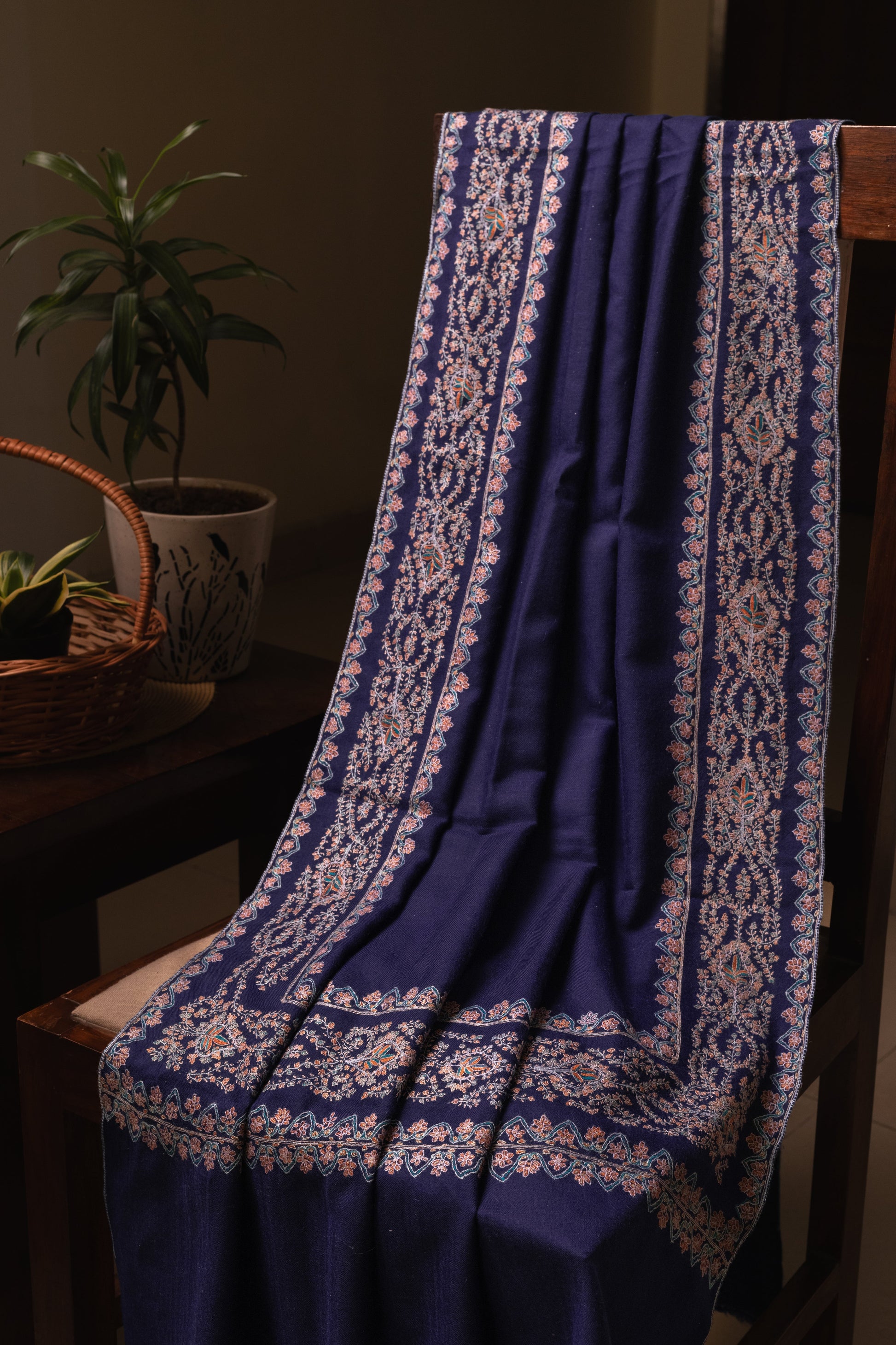 Royal Blue Pashmina shawl with Sozni Embroidey Border